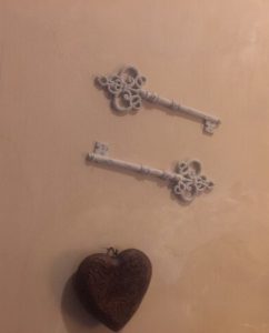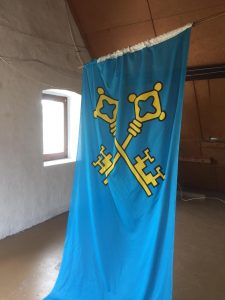 Wir erhielten bereits die Schlüssel zum Haus 21! Zur Feier des Tages brachte Simone als Geschenk zwei symbolische Schlüssel mit, die in unserer Küche als Zeichen an der Wand verewigt wurden. Interessanterweise zeigte sich einige Wochen später, dass die ganze Zeit im Haus 21 versteckt und eingerollt auf dem Dachboden ein Fahne mit genau solchen zwei Schlüsseln hing! Sie warteten schon auf uns, ohne dass wir es wussten – wieder Mal ein Zeichen 😉